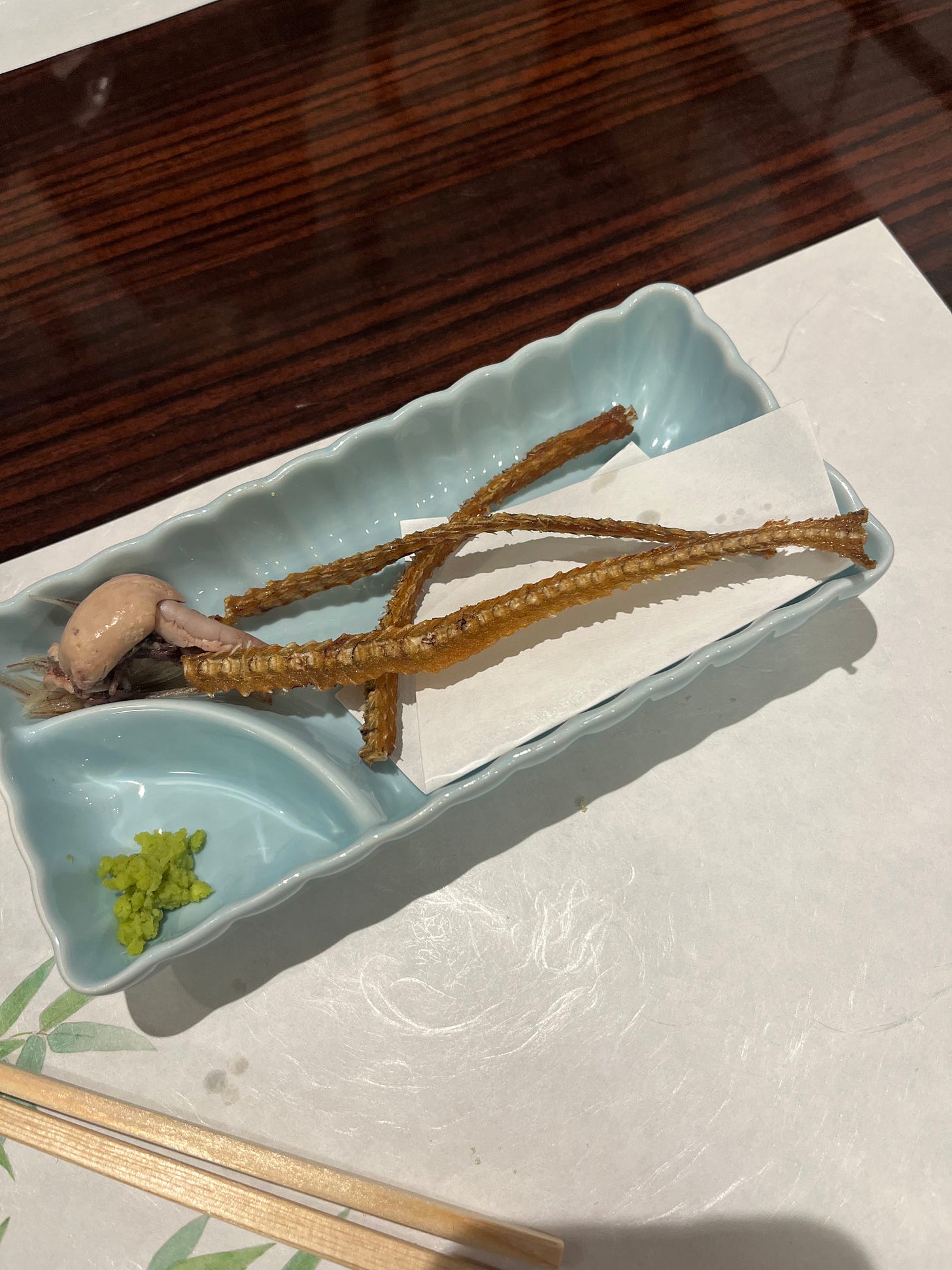 Our meal at Ten Yokota was eaten in almost-complete silence. Everyone was in awe of the chef, fawning on taisho like he’s a Boddhisattva. He plays the part well, lording over the room with a mysterious smile, giving commands. Instead of blessing us with prayer, he places a single piece of fried negi, or whatever, on the counter in front of you. He tells you to dip it in sauce or salt or nothing. You savor the bite. It’s delicious, admittedly. Granted, I think frying deserves more respect than it gets. But now imagine eating one french fry at a time, in dead silence, with many rules about how you’re allowed to eat said fry. Feels just the tiniest bit absurd, no?