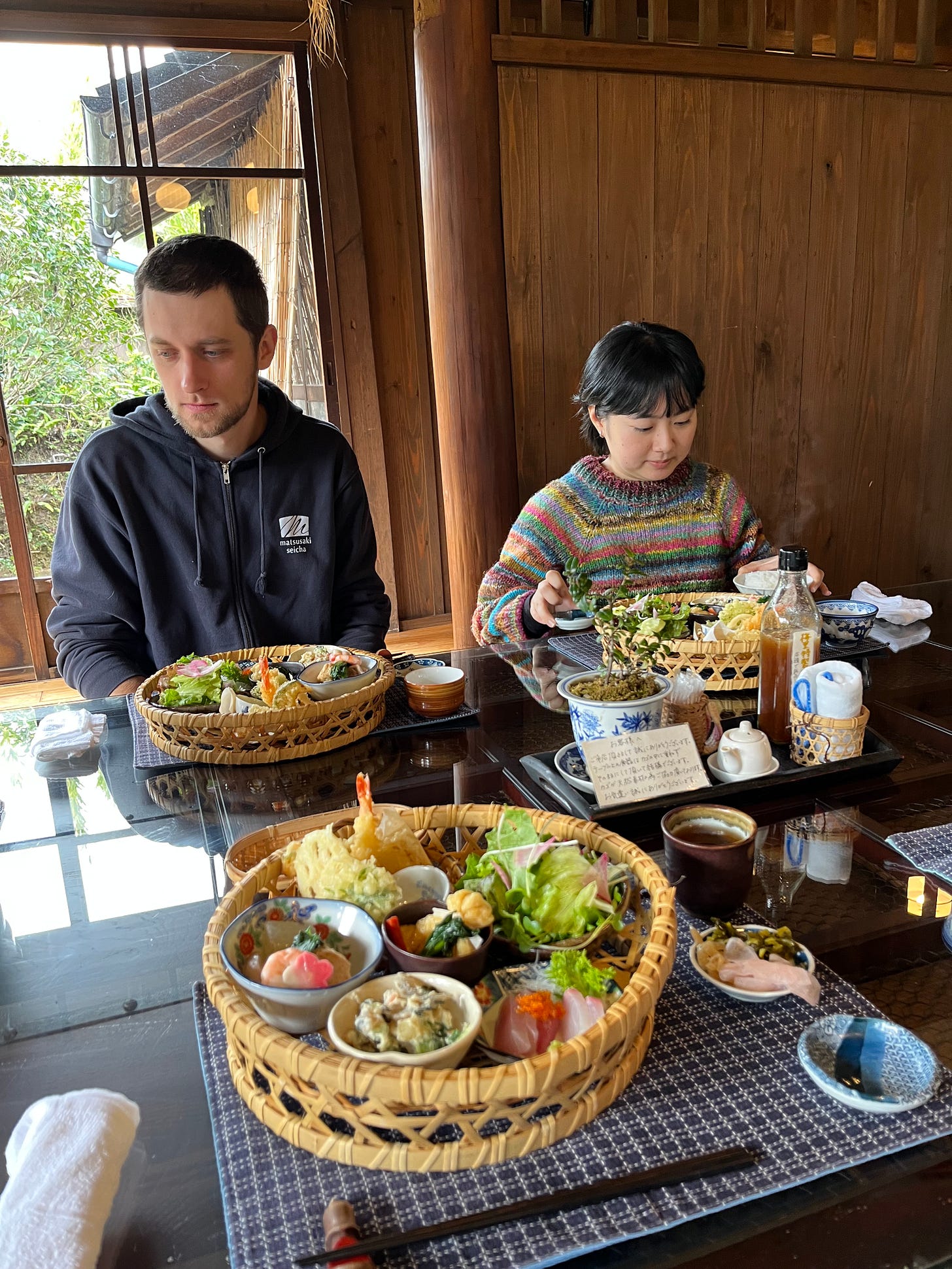 Lunch in an Edo Period samurai farmhouse, next to the ocean, at the southernmost tip on Japan, with friends. Everything spoke of domestic refinement: careful, thoughtful, cozy. The most representative dish was a mochi-filled aburaage: humble, wholesome, delicious. Otherwise, a few pieces of tempura, a few pieces of sashimi, a few pieces of oden-adjacent simmered dishes, a small salad, rice from the owner’s farm. Free refills on soup and tea. Scattered thunderstorms. Intimacy.