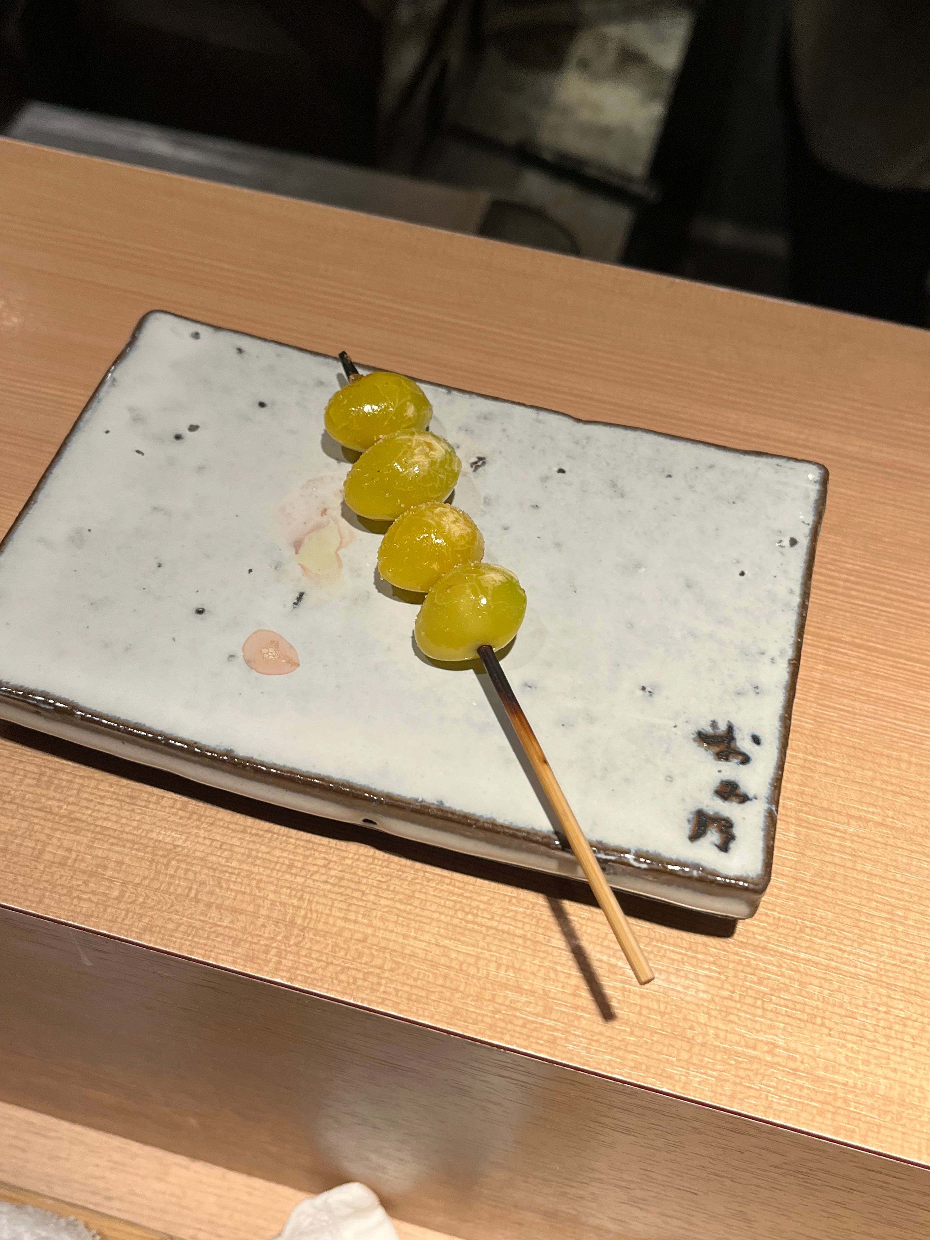 As we paid homage to the bodies of birds, piece by piece, occasionally our chefs would throw in some plant matter, to mix things up. I don’t get yakitori for the vegetation but the ginkgo nuts really took me by surprise. In a way they reminded me of really good Sicilian pistachios, but more cheesy. Weird grilled pistachio-adjacent nut-cheese — what’s not to like? Neurotoxins, for one. That’s the catch: the eponymous Ginkgotoxin. Enjoy a few too many and they will send your Vitamin B6 levels plummeting, leading to seizures, hospitalization, death. So why are we eating these things? Because there’s a threshold. What kind of threshold? In the medical literature, some cases say 20, some say 40, some say 80. Everyone is different. We were served four a piece. I felt I could have eaten more. They were really delicious. I was tempted, for a second, to discover my own limits. Malu didn’t finish hers so I had a fifth, then a sixth. I’m still here. Or so it seems.