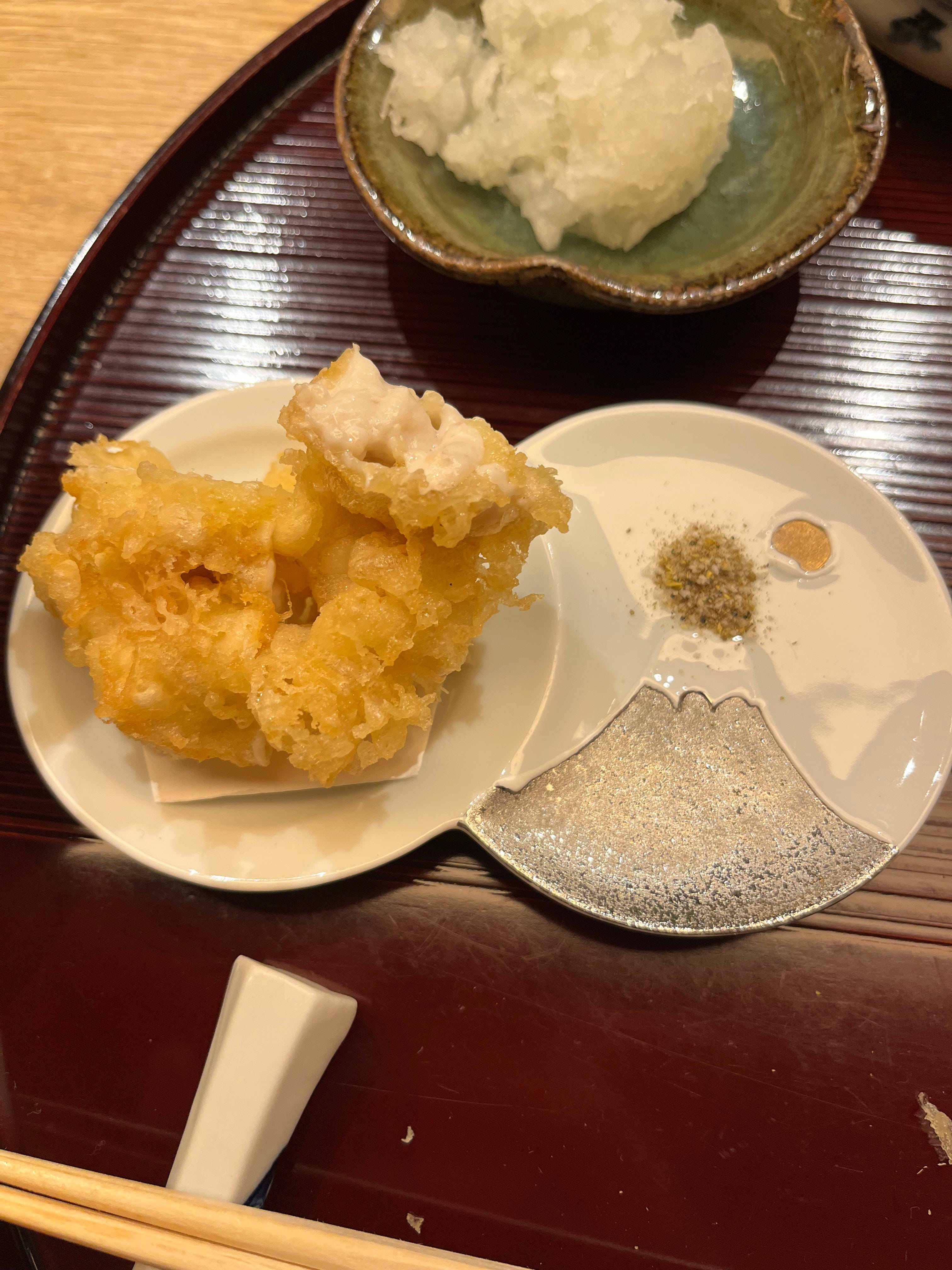 Weird vibes notwithstanding, I’d been wanting to try kaiseki-style tempura for a long time, and Ten Yokota didn’t disappoint food-wise. The shirako was especially glorious: a fragile, glass-like crust, smelling faintly of sesame oil, surrounds fragile, creamy cod “milt” (in less-polite company you could say “jizz”). We had shirako in many forms on this trip and this one was top, due in large part to the textural contrast between crunchy and creamy.