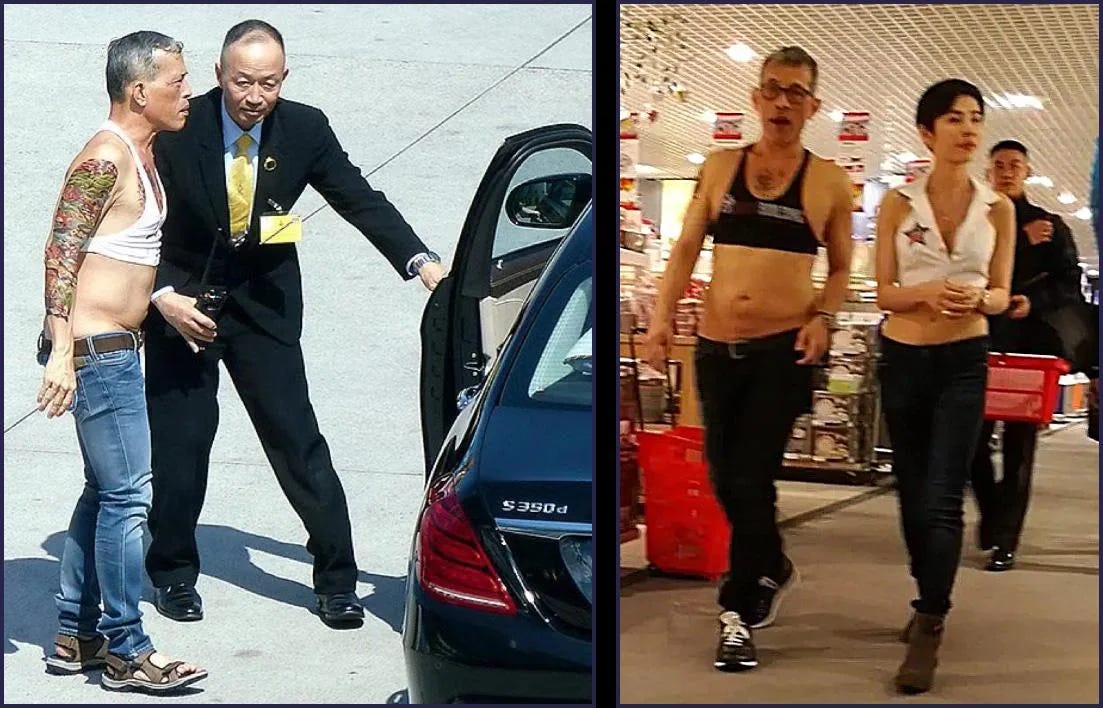 Through a quick Google search, you can also find surveillance camera pictures of Rama X where he is wearing a sleeveless crop top, with fake yakuza tattoos stenciled underneath. It seems this is a fashion statement he likes to make privately, often accompanied by one of his wives (of which he’s had four) or mistresses. Unlike the portraits where Rama X wears full ceremonial dress, these photos are, of course, illegal to reproduce in Thailand.