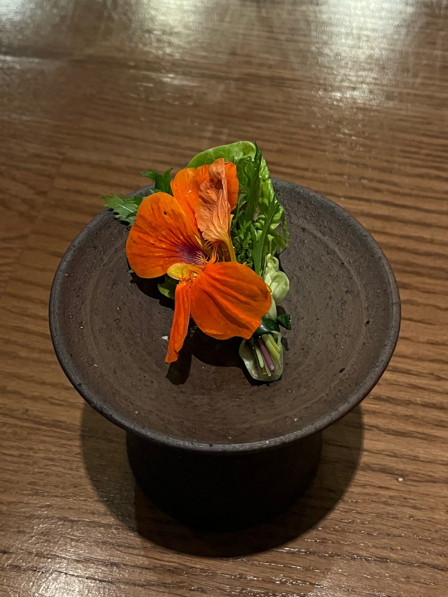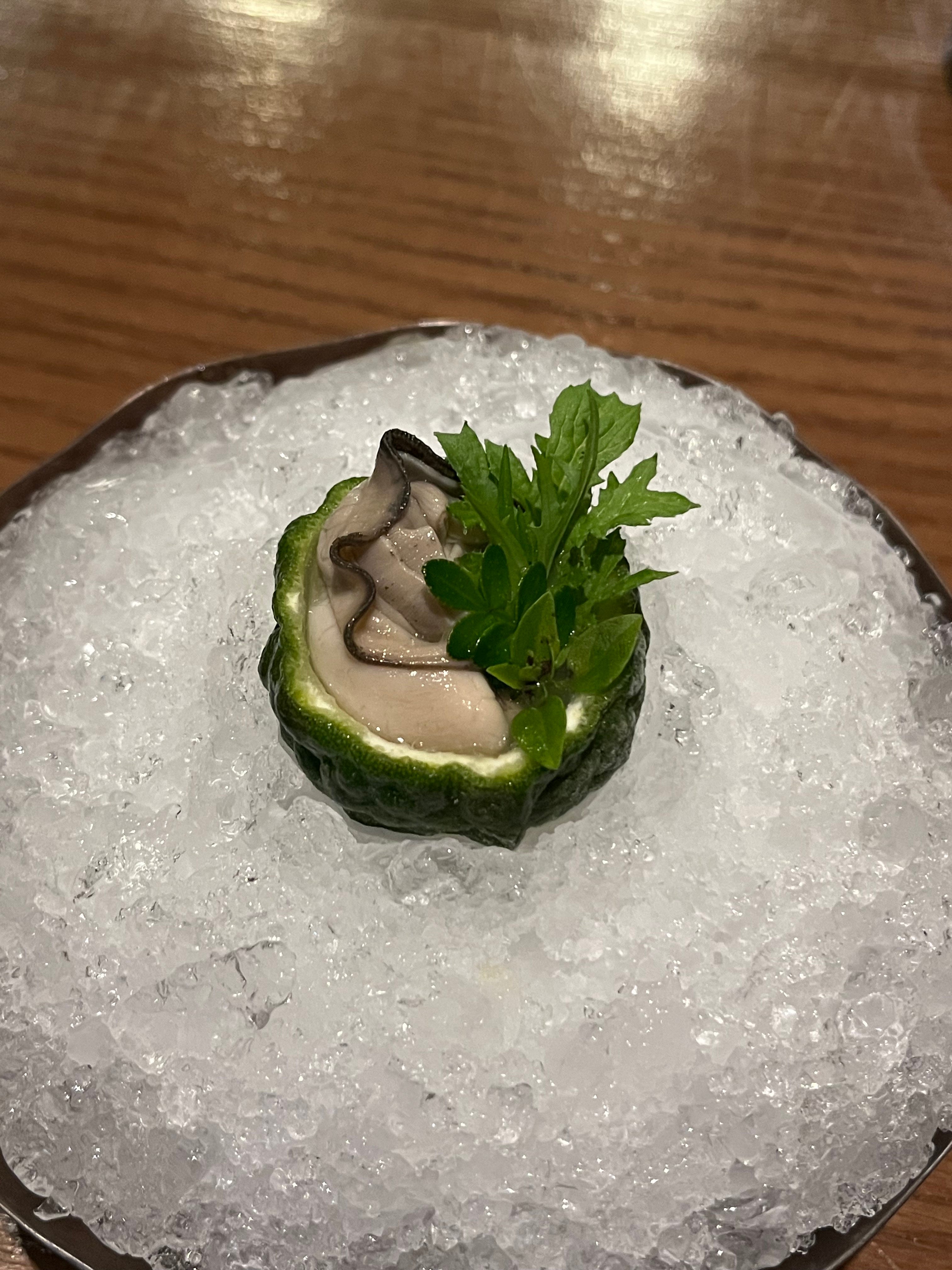 Against the odds, the food at Ore made me feel good. Not all of the food, mind you — when you’re served literally dozens of dishes, some of them will inevitably be less successful. But the opening salvo (let’s say, the first 10 dishes) had some absolute bangers. I doubt I’ll ever be able to forget dish number 5: one gorgeous bite of mizuna, nasturtium, and fried chicken skin. If I had my way, I’d eat about fifty. Dish number 10 was equally mind-blowing: an oyster served in a hollowed-out makrut lime with a few leaves of sansho. So bright and green and fragrant and briny. Waiter? Could I get 11 more?