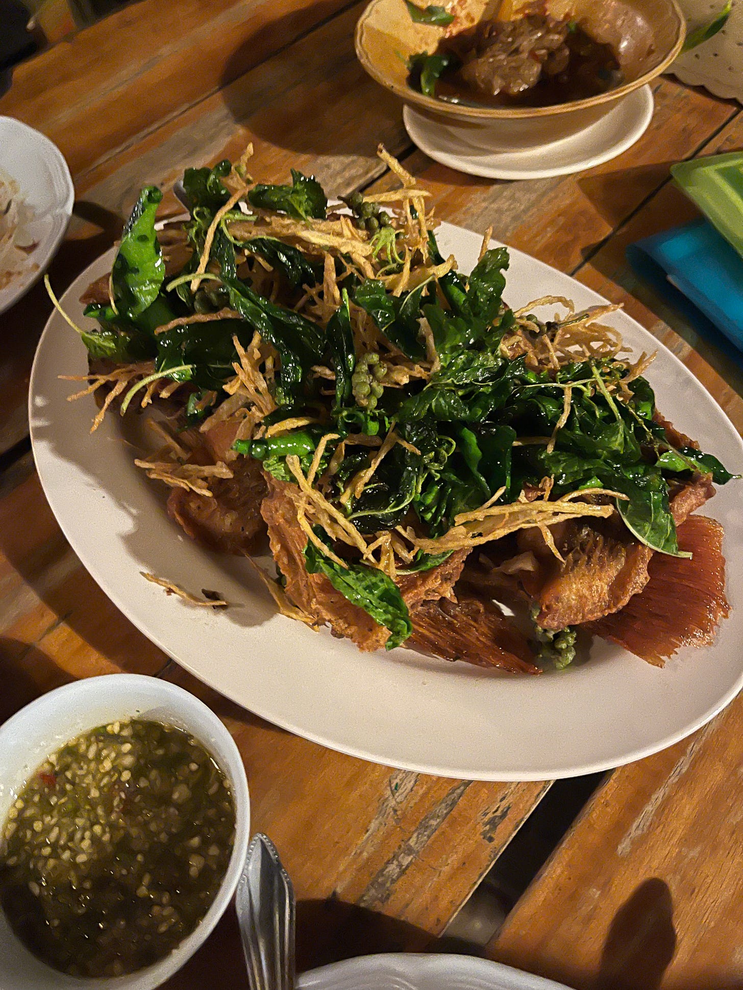 Come back we did. This time ordered a nam prik hors d’oeuvres platter, oyster mushrooms with some kind of chili sauce, and the most insane deep fried catfish, which was covered by a huge heap of fried kaffir lime leaves, galangal, and bunches of green peppercorns. Unfortunately, they were once again 86 bee larvae. Guess I just have to go back, again.