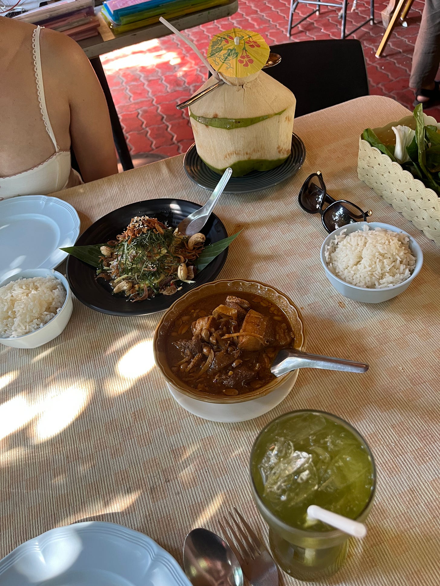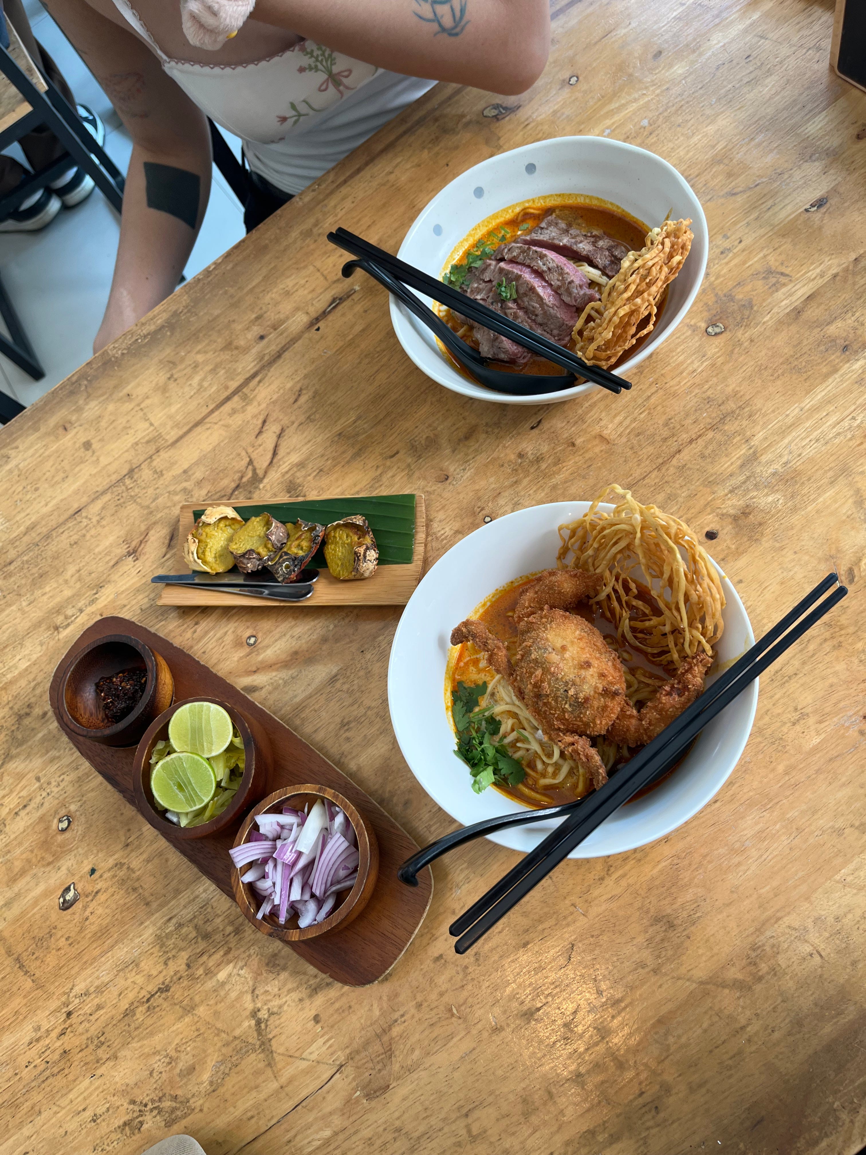 My favorite restaurant that we visited in Thailand. I was lured here when I saw Andy Ricker — chef of Pok Pok fame and Chiang Mai resident — posting pictures with a plate of grilled bee larvae, served inside the honeycomb. So cool. There are many other local Lanna specialties across the menu: ant egg salad, stir fried gurmar with eggs, a sour sausage, soft enough to remind me of nduja. Besides these, we also got a salad called Yum Samun Phrai, and a yellow curry made with pork belly. Both dishes floored me. I’m a sucker for a bright, herbal, anti-salad (by which I mean, the kind of “salad” that foregoes leafy greens for crunchy veg, herbs, and nuts), and Yum Samun Phrai takes that concept to the nth degree. It’s an explosion of white turmeric, lemongrass, sawtooth, shredded betel and kaffir lime leaves, topped with cashews, fried shallots, and dried shrimp, then dressed with coconut milk, fish sauce, and lime juice. Unreal. Its freshness was the perfect counterbalance to the pork belly curry which was sweet and rich, topped with slivers of ginger and crushed peanuts. The only problem with the meal was that they were 86 bee larvae. Which meant we had to come back.
