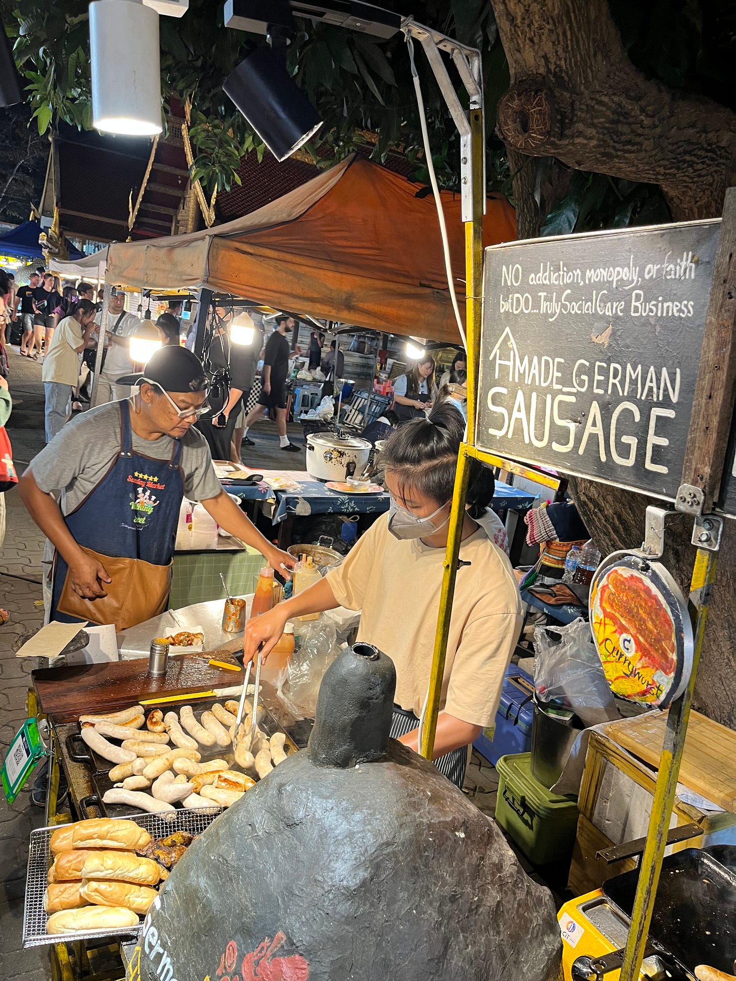 The longest line at the Chiang Mai Sunday Night Market was for currywurst. The cook, as well as his customers, were all Thai, and above the grill there was a sign in English that read, verbatim, “No addiction, monopoly, or faith but DO… Truly Social Care Business HMade German Sausage”. When I got to the front of the line the chef refused to speak either Thai or English with me, and responded to my order in German instead. If I was a journalist, I’d have dug deeper — Lord knows there’s a story behind this spot. Fortunately, I’m not a journalist. I’m just hungry. Great currywurst.